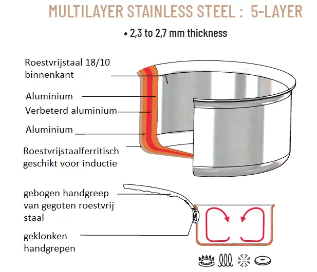 Deze keramische antiaanbaklaag is PFAS-vrij en dankzij de multi-layer 5-PLY heeft deze bakpan een ideale warmtegeleiding.