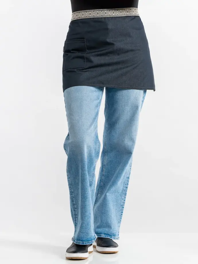 De stevige katoen-polyestermix voelt prettig aan en is bestand tegen dagelijks gebruik. Met een handige heupzak en flexibele knoopoptie aan de achter- of voorkant.