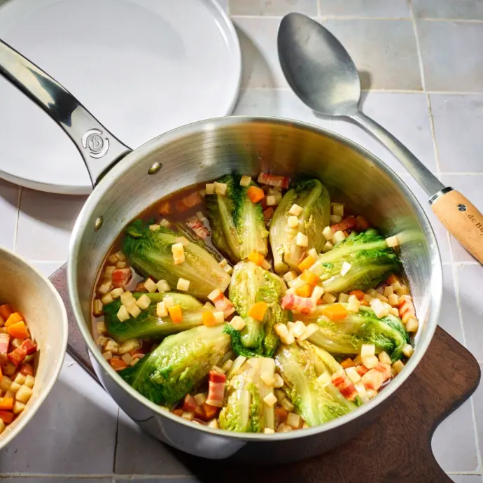 De Buyer Affinity pannen zijn opgebouwd uit vijf verschillende metalen lagen: een buitenlaag van roestvast staal, gevolgd door drie lagen aluminium en een roestvaste laag aan de binnenkant. Deze lagen zijn doorgetrokken van de bodem tot aan de schenkrand. Hierdoor wordt de warmte in de pan optimaal doorgegeven. Deze egale spreiding is ideaal voor sauzen en reducties. Doordat hier ook roestvast staal in is verwerkt is de pan ook geschikt voor gebruik op inductiekookplaten.