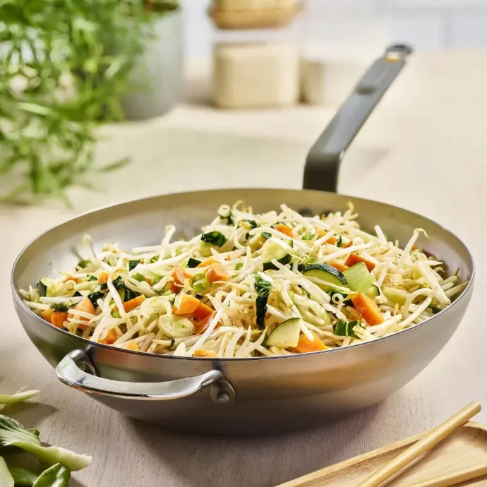 Gemaakt van koolstofstaal, biedt de 40 cm wok een snelle opwarming en uitstekende thermische reactievermogen, essentieel voor intensief koken en grote hoeveelheden. Hiermee kun je met zeer weinig vet koken, terwijl je toch een gelijkmatige garing en mooie bruining bereikt.