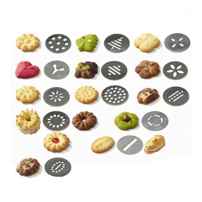 Geleverd met speciale kit voor zandkoekkoekjes, bestaande uit 2 platte deksels, een speciaal deksel (schijfhouder) en 13 verwijderbare decorschijven voor het maken van verschillende en originele zandkoekjes en soezendeeg.