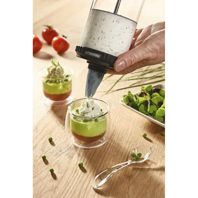 Le Tube, een drukspuit voor gebak met dezelfde toepassingen als spuitzakken: vullen, garneren, decoreren en het voordeel van doseren. Ideaal bij dikke bereidingen zoals crèmes, dikke mousses, soezendeeg..